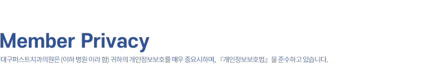 대구퍼스트치과은 (이하 병원 이라 함) 귀하의 개인정보보호를 매우 중요시하며, 『개인정보보호법』을 준수하고 있습니다.